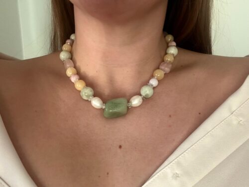 The Dare to Dream necklace features beautiful round pastel jade stones, with the centerpiece being a fascinatingly asymmetrical green jade. Jade is believed to help focus on the positive things around us and strengthen our belief in our own dreams. Jade encourages boldness and decision-making from the heart, reminding us that every day is an opportunity to move closer to our dreams. Additionally, the necklace includes soft pink rose quartz beads, which remind us of the importance of focusing on everything we love around us – including ourselves.