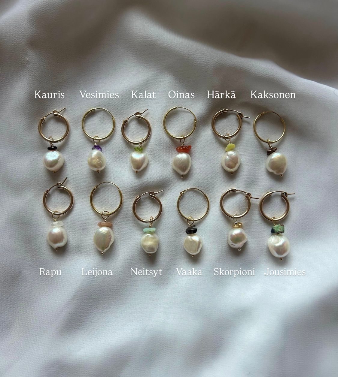 Horoskooppimallisto laajenee ja paljon toivotut horoskooppikorvakorut on nyt täällä! Korviksissa yhdistyy jokaisen horoskoopin oma onnenkivi ja kaunis makeanvedenhelmi. Korvikset on saatavilla sekä kultaisilla ja hopeisilla renkailla. Tutustu horoskooppikiviin ja löydä omasi.