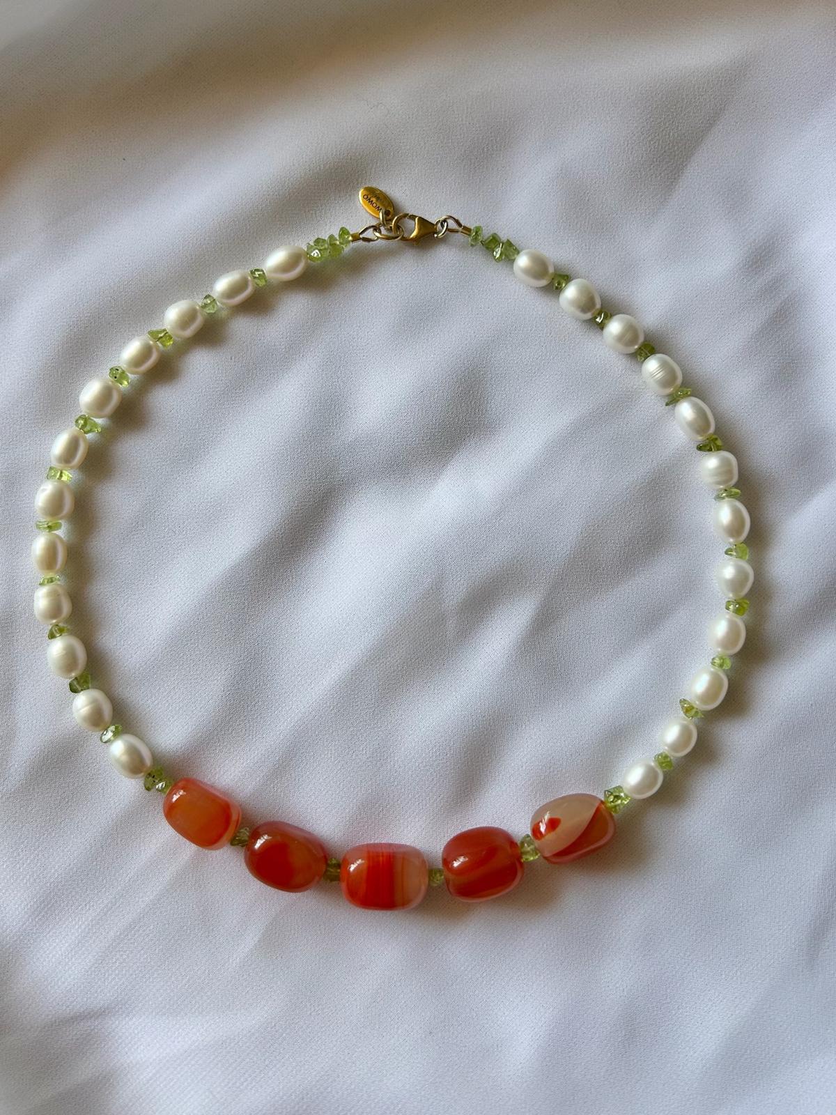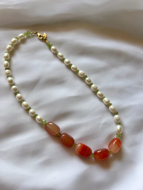 Passion -kaulakorussa kivinä on kaunis oranssin sävyinen karneoli ja upea raikkaan vihreä peridootti. Karneolia kutsutaan päättäväisyyden ja itsevarmuuden kiveksi. Sen uskotaan lisäävän kantajalleen elinvoimaa, rohkeutta sekä intohimoa. Lisäksi sanotaan, että karneoli auttaa keskittymiskyvyn kehittämisessä. Peridootin sanotaan taas lisäävän positiivisuutta elämään. Se rohkaisee luovuuteen kaikilla elämän osa-alueilla. Peridootin uskotaan myös tuovan tasapainoa ja rauhaa sekä poistavan kielteisiä ajatuksia. Aika ihana kombo – vai mitä?